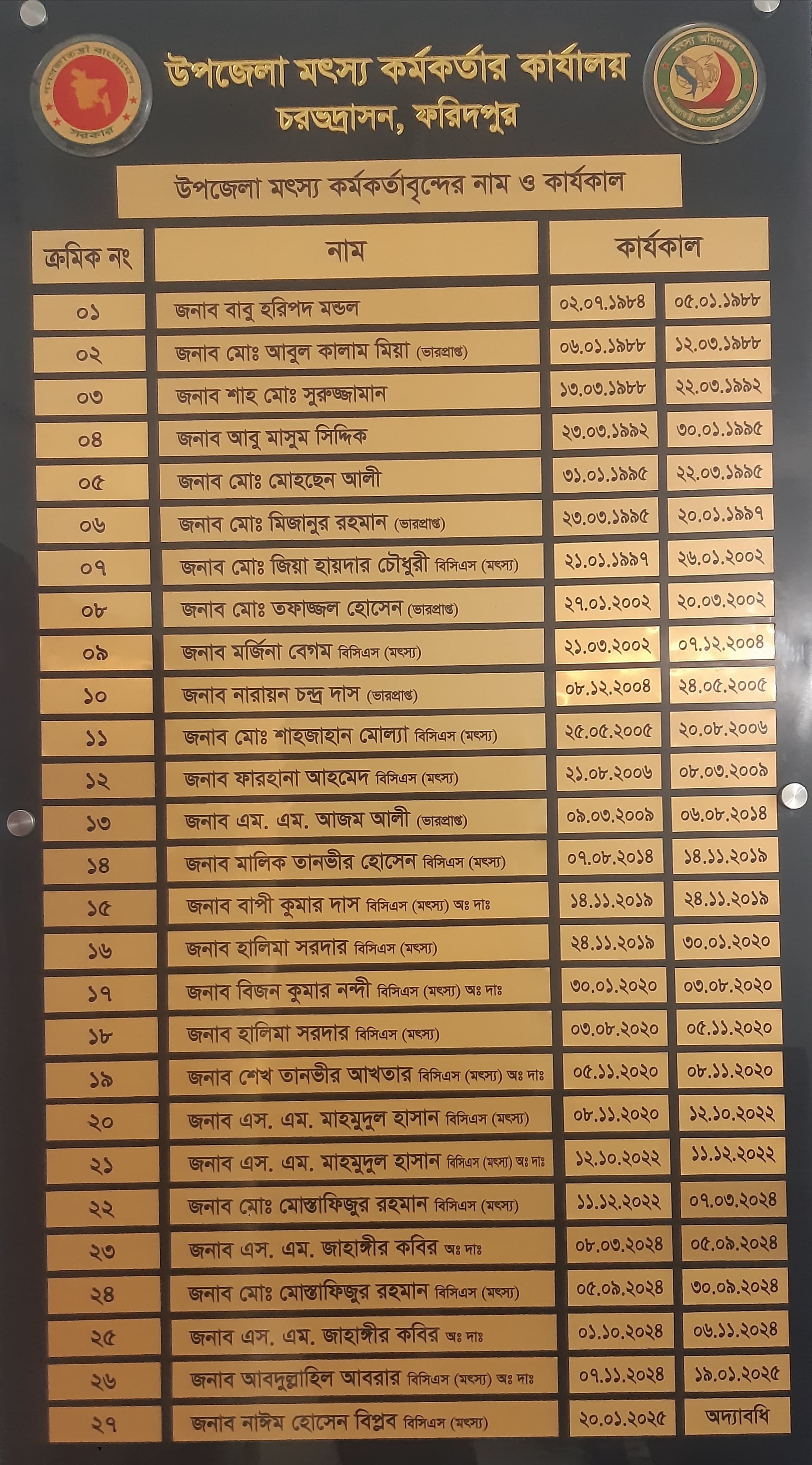 | ১১. | জনাব মোঃ শাহজাহান মোল্যা, বিসিএস (মৎস্য) | ২৫.০৫.০৫ | ২০.০৮.০৬ |